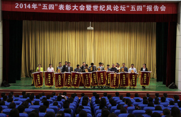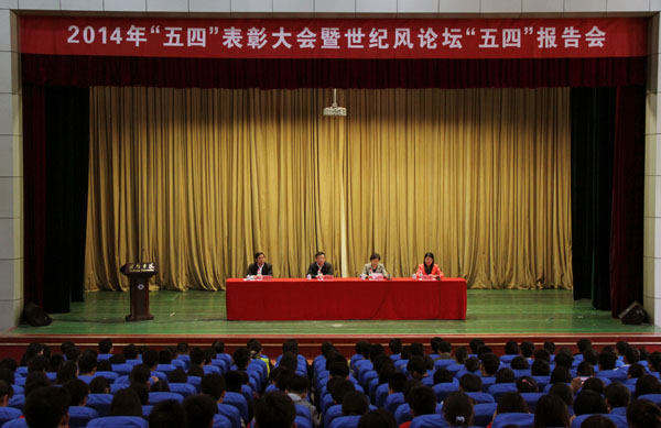 本站讯 5月4日,2014年五四表彰大会暨世纪风论坛——“五四”报告会在图书馆报告厅举行。党委书记辛丕宏出席报告会。学校领导辛丕宏、马茜华为获奖集体和个人颁奖。大会由纪委书记马茜华主持。校团委委员,学工部负责人,各教学单位分管学生工作负责人、团总支书记,校学生会、二级学院学生分会骨干成员,获奖集体与个人代表共500余人参加了报告会。