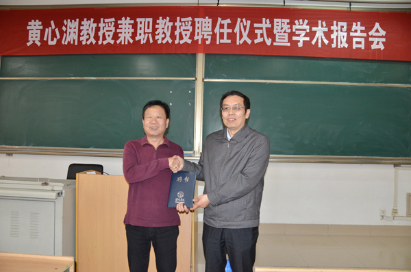 本网讯 4月13日,学校举行仪式,聘请中国传媒大学动画与数字艺术学院院长、博士生导师黄心渊教授为我校兼职教授。副校长王旭升向黄心渊颁发了聘书。仪式由传媒学院负责同志主持。仪式之后,黄心渊为传媒学院的部分师生作了题为《虚拟现实与人才培养》的学术报告会。