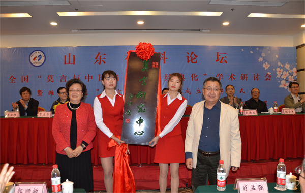 本网讯 4月15日,山东社科论坛“莫言与中国当代文学经典化”学术研讨会暨潍坊学院“莫言研究中心”成立揭牌仪式在潍坊富华大酒店隆重举行。校长冯滨鲁在开幕式上讲话,山东省社会科学界联合会党组副书记、副主席周忠高,中国当代文学研究会副会长张志忠,山东省作家协会副主席赵德发先后致辞。开幕式由副校长赵光强主持。省当代文学研究会会长张学军、省莫言研究会副会长贺立华、市社科联副主席李启胜出席开幕式。张志忠和山东省作协副主席李掖平共同为我校莫言研究中心揭牌。