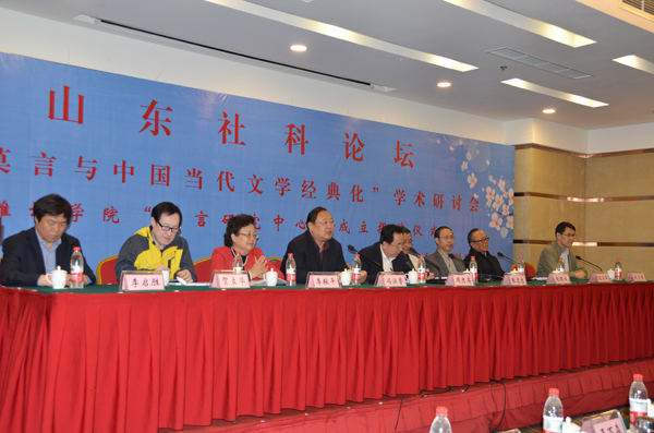 周忠高在讲话时对莫言研究中心的成立表示祝贺,他介绍了今年社科论坛的计划情况,对文学评论提出了希望和要求。张志忠、赵德发在致辞时分析了当代文学研究的现状,希望与我校莫言研究中心加强学术交流。