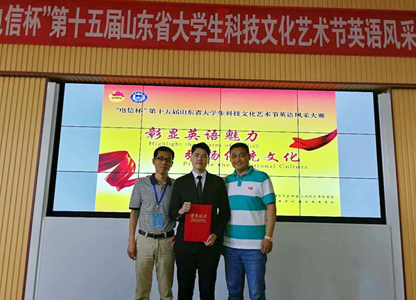 本网讯 6月3日,“电信杯”第十五届山东省大学生科技文化艺术节英语风采大赛在烟台落下帷幕。我校外国语学院许海光同学以总分第一名的好成绩力挫群雄,在来自全省各高校的33名选手中脱颖而出,夺得冠军。