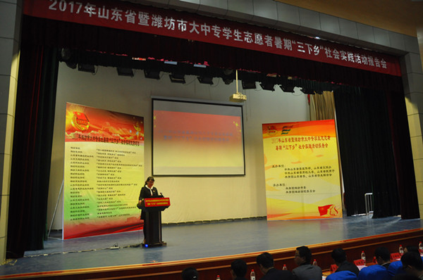 本网讯 11月2日,2017年山东省暨潍坊市大中专学生志愿者暑期“三下乡”社会实践活动报告会在学校图书馆报告厅隆重举行。学校副校长王清明、共青团潍坊市委书记刘艳芳、副书记陈珊珊、学少部张帅,驻潍14所大中专院校团委负责同志及相关负责同志出席了本次会议。校团委班子成员、各学院团总支书记副书记、驻潍各大中专院校社会实践优质项目团队和学生代表近500人参加了报告会。