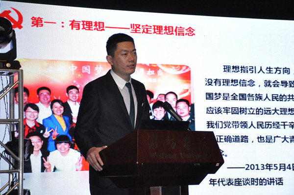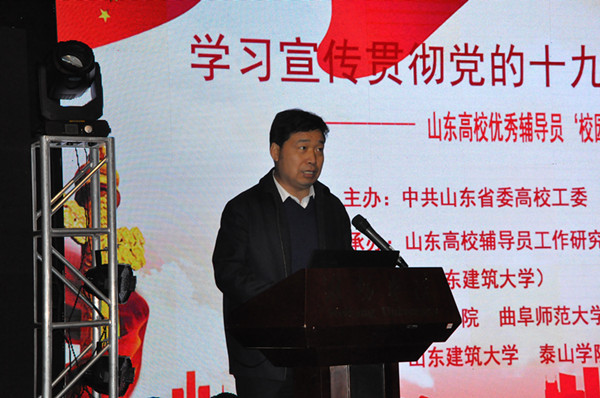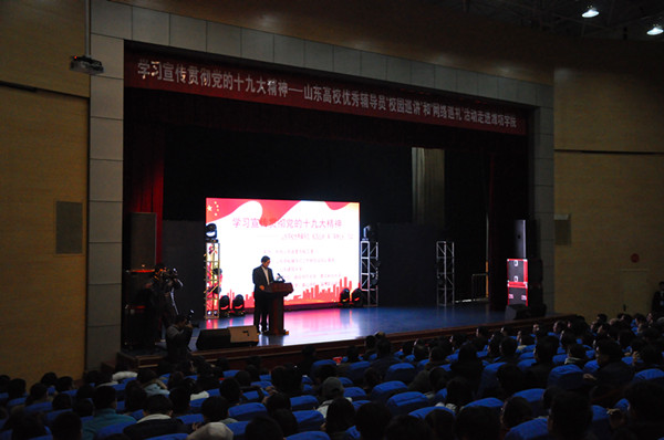 本网讯 为推动党的十九大精神的学习宣传和贯彻落实,中共山东省委高校工委组织开展了“学习宣传贯彻党的十九大精神——山东高校优秀辅导员‘校园巡讲’和‘网络巡礼’活动”,省委高校工委从全省高校精心挑选了30名优秀辅导员组成宣讲团,分6个小组赴相关高校开展巡讲活动。12月14日,第4小组在省委高校工委宣教处杨广杰处长率领下来我校进行宣讲。宣讲会在图书馆报告厅举行,副校长王清明出席了会议并致辞。学生处负责同志主持了会议。
