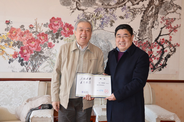 本网讯 3月9日,香山科学会议组委会副主任杨炳忻教授应邀来校座谈,党委书记孙文亮向他颁发了客座教授的聘书。副校长赵光强、相关企业负责同志,我校办公室、科研处负责同志参加了座谈会。