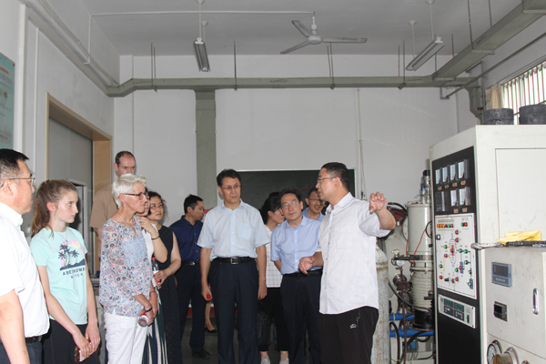 在赵光强的陪同下,安妮•内维尔一行实地考察了机电与车辆工程学院实验室。