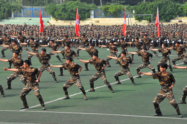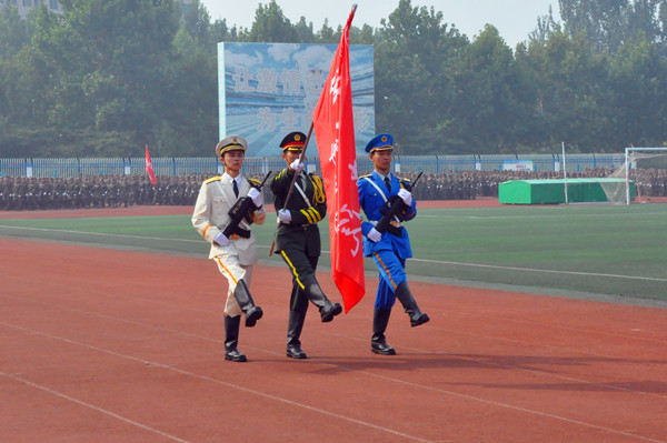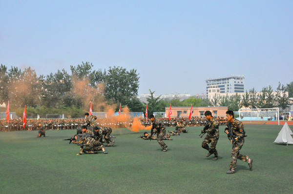 庄严的升国旗仪式后,2018级新生军训方队迈着整齐的步伐,喊着嘹亮的口号,斗志昂扬的从主席台走过,接受与会领导的检阅。之后,他们进行了军体拳、正规化动作、捕俘与格斗、战术与战地救护等表演。