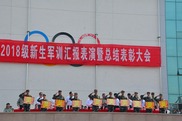 会上,党委书记孙文亮向承训部队赠送锦旗。军训团政委李学军宣读新生军训团表彰决定,与会领导为获奖集体和个人颁奖。2018级新生张潇文代表参训学生发言。