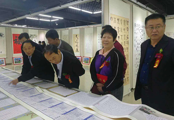 本网讯 10月20日,潍坊市第六届硬笔书法展暨书画名家作品展在我校美术馆开幕。副校长丁子信出席开幕式并致辞。潍坊市文联副主席任学军,日照银行潍坊分行党委书记、行长王志刚,中国硬笔书协理事、山东工委名誉主席、潍坊市硬笔书法家协会荣誉主席、大展组委会主任高华忠,中国硬笔书协会员、山东工委副主席、潍坊市硬笔书法家协会主席齐玉华,潍坊硬笔书法家协会副主席兼秘书长、潍坊枫丹白露美术学校校长赵青,学校院教务处、美术学院负责同志参加开幕式。