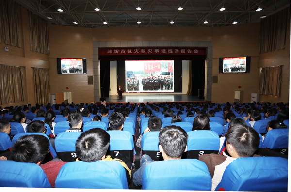 本网讯 为弘扬抗灾救灾精神,进一步动员全市上下团结一致、万众一心,坚决打赢灾后重建攻坚战,市委宣传部、市文明办牵头组建了潍坊市抗灾救灾报告团,在全市开展巡回报告。10月24日,报告团来我校举办巡回报告会,5名来自我市抗灾救灾战线的报告团成员分别作报告。报告会由党委书记孙文亮主持。