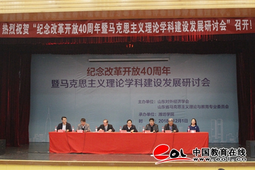 潍坊学院党委书记孙文亮教授首先致辞,热烈欢迎来自全国各地的专家学者莅临潍坊学院参加“纪念改革开放40周年暨马克思主义理论学科建设发展”研讨会,并以自己的亲身经历阐述了党的改革开放历程和中国社会的发展变化。针对马克思主义理论学科的发展,孙文亮教授指出,这一学科在我国经历了从小到大、由弱变强、体系不断完善的三个阶段,即:1978年至2005年是马克思主义理论学科的理论奠基时期;2005年至2012年的第二阶段,是马克思主义理论学科创立发展时期;2012年至今的第三阶段是马克思主义理论学科强化引领时期。山东对外经济学会会长王培志在致辞中指出,通过研讨会的举办,将为高校同行深入交流提供平台,对探讨如何实现马克思主义在高校意识形态领域的主导地位,如何建设具有强大凝聚力和引领力的社会主义意识形态,充分发挥马克思主义理论学科对于哲学社会科学的引领作用具有重要的意义。山东省马克思主义理论与教育专业委员会主任周向军在致辞中,阐述了山东省马克思主义理论与教育专业委员会的主要任务:一是组织开展研究生马克思主义理论课教育与教学研究,二是组织开展研究生马克思主义理论学位与学科建设,三是组织开展政治理论专业方面调研和考察。接下来的主题报告中,山东省社会科学界联合会党组副书记、副主席周忠高作了《习近平新时代中国特色社会主义思想是马克思主义中国化的集大成》的报告,主要探讨了习近平新时代中国特色社会主义思想的意义和重要价值。上海交通大学马克思主义学院陈锡喜教授作了《新时代加强马克思主义理论学科建设需强化四大意识》的报告,陈教授在报告中分析了近十年来马克思主义学科建设在学科定位、学科功能、学科基础以及学科研究等方面存在的问题,提出要强化四大意识,即:学科意识、咨政意识、经典意识和问题意识。华东师范大学杜玉华教授从三个角度深刻阐述了中国改革开放的世界意义:中国改革开放的持续发展为世界经济社会发展提供了新动力;中国改革开放打破了“西方化”,为人类实现现代化开辟了新道路;中国改革开放走出了“苏联模式”,为社会主义创造了新形态。在会议讨论中,山东大学马克思主义学院(威海)党委书记郝书翠教授、山东科技大学马克思主义学院副院长邵勇教授、临沂大学克思主义学院副院长费聿辉教授、中国海洋大学马克思主义学院副院长王付欣副教授、青岛科技大学马克思主义学院朱鹰副教授、齐鲁工业大学马克思主义学院徐舒映教授、潍坊学院经济管理学院魏丽萍副教授、潍坊学院马克思主义学院院长刘勇教授等分别就改革开放和马克思主义理论学科建设进行了交流和探讨。
