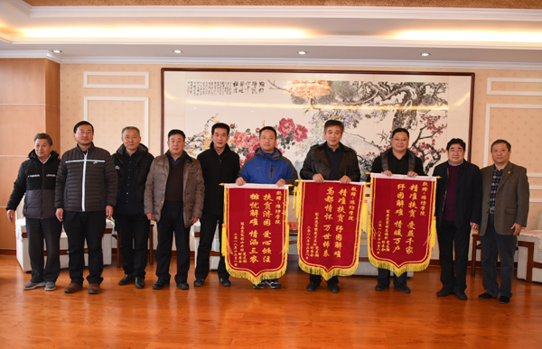 本网讯 12月11日,聊城市冠县范寨镇人大主任张继德同志带领戴里庄村、马楼村、小井村三个村的村干部一行8人来我校,赠送“精准扶贫纾困解难鸢都情怀万事师表”等三面锦旗,向我校为村庄发展所作出的重要贡献和“第一书记”们的辛勤付出,表达衷心的感谢。党委书记孙文亮会见了客人,并代表学校接受锦旗。