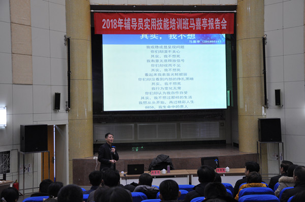 本网讯 12月28日下午,我校2018年辅导员实用技能培训班马喜亭教授报告会在行政楼一楼报告厅举行,北京航空航天大学副教授、硕士研究生导师马喜亭作专题报告。学校党委副书记王清明出席报告会。各二级学院主管学生工作负责人、全体专兼职辅导员,学生工作处、大学生心理健康指导中心全体工作人员近150人参加报告会。