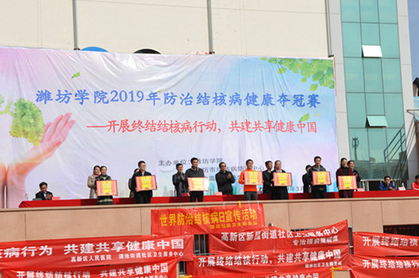 本网讯 3月22日下午,我校联合潍坊市结核病防治中心、潍坊高新区卫生和计划生育局,在学校体育场举办了“潍坊学院2019年防治结核病健康夺冠赛”。副校长王旭升、潍坊市卫健委副主任王象斌分别做了讲话,学生代表宣读了“百千万结核病防治志愿者招募倡议书”。开幕式上为“结核病防治知识网络竞赛活动”中7个优秀组织单位颁发了奖状。