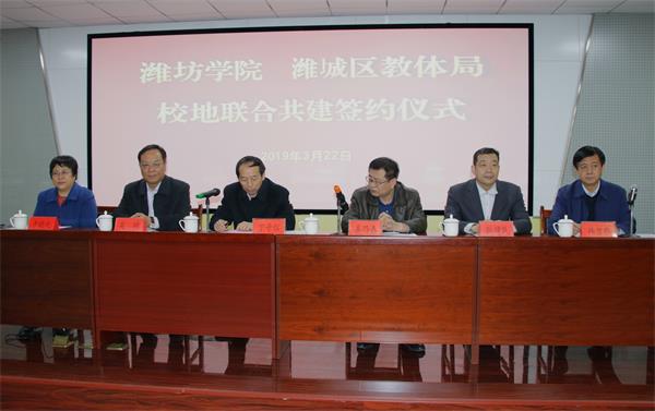 本网讯 3月21日,潍坊学院与潍城区校地联合共建签约暨教学实践基地授牌仪式在潍州麓台学校举行。副校长丁子信,潍城区重点项目推进办公室副主任于晓光出席仪式并分别致辞。丁子信与潍城区教体局局长韩吉东代表双方在合作协议书上签字。教师教育学院负责人与教学实践基地挂牌学校代表签订协议。