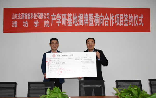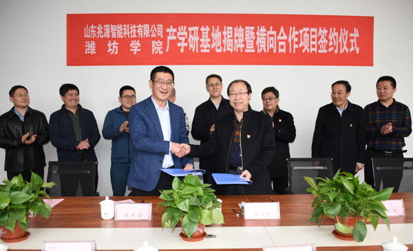 本网讯 3月28日,我校“电子信息技术产学研合作基地”“光电信息技术实验实训基地”揭牌暨横向项目签约仪式在潍坊光电产业园举行,两基地落户位于产业园的山东兆源智能科技有限公司。副校长赵光强出席活动并揭牌,物理与光电工程学院相关负责同志参加与该公司达成的横向合作项目签约仪式,项目经费达200万元。