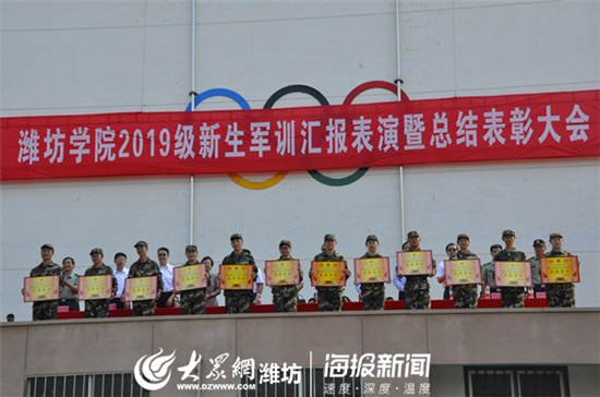 会上,潍坊学院党委书记孙文亮向承训部队赠送锦旗。军训团政委李学军宣读新生军训团表彰决定,与会领导为获奖集体和个人颁奖。2019级新生康文馨代表参训学生发言。