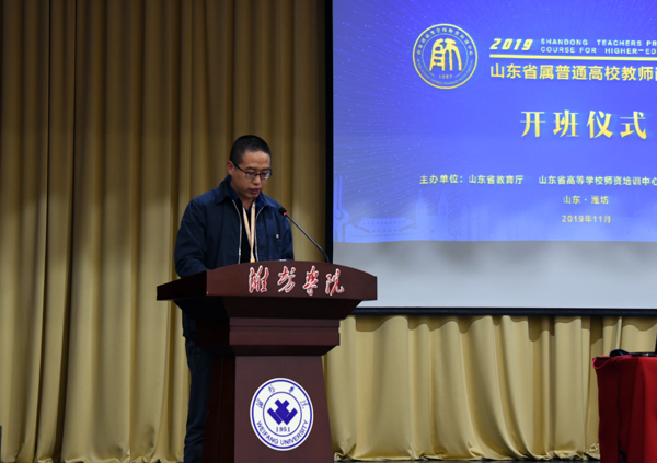 开班仪式上,赵光强代表学校对各位学员表示热烈的欢迎和祝贺,向大家介绍了潍坊学院的基本情况、办学特色、师资队伍以及近年来学校各项事业取得的成绩。他指出,为办好本次培训,学校做了精心的组织和准备工作,充分论证培训方案,建立了由国内著名专家教授和名师构成的专家团队以及指导教师团队。他对培训工作提出三点要求:一是要高度重视,认真贯彻落实培训方案。二是要调整心态,转换角色,全身心投入到学习中。三是要自觉遵守纪律,高质量完成各项培训任务。