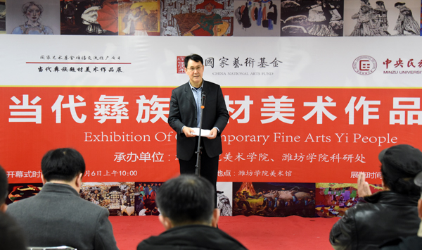 本网讯 1月6日上午,由中央民族大学主办,我校美术学院和科研处承办的,2019年度国家艺术基金传播交流推广资助项目,“当代彝族题材美术作品展”在学校美术馆举行。校长冯滨鲁,纪委书记王建新参观了展览。副校长赵光强致开幕词。