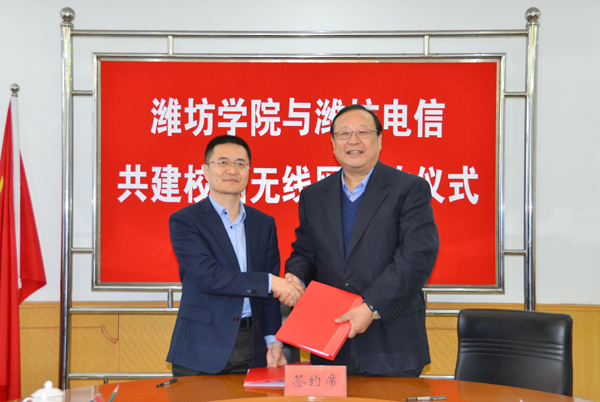 本网讯 1月14日,我校与潍坊电信合作共建校园无线网签约仪式举行。校长冯滨鲁与潍坊电信总经理任永刚代表双方在合作协议上签字。副校长丁子信、潍坊电信副总经理赵长波先后在仪式上讲话。仪式由办公室负责同志主持。