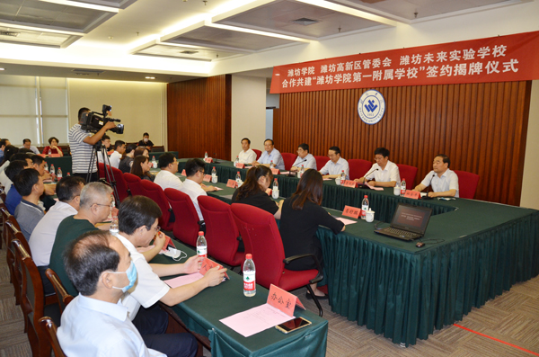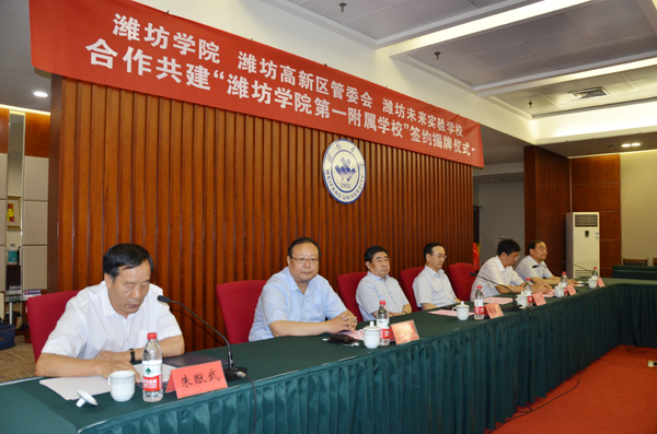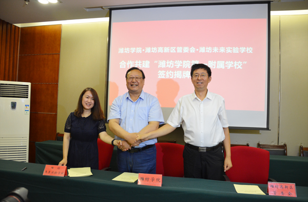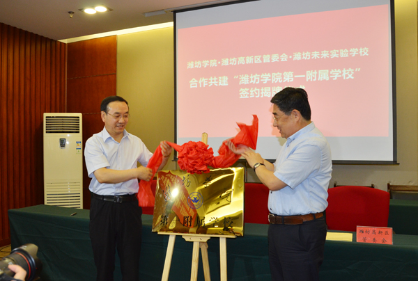 本网讯 7月11日,潍坊学院与潍坊高新区管委会、潍坊未来实验学校合作共建“潍坊学院第一附属学校”签约揭牌仪式在学校体育馆举行。学校党委书记孙文亮和潍坊高新区党工委书记、管委会主任宋赤锋为“潍坊学院第一附属学校”揭牌。校长冯滨鲁,高新区管委会副主任贾延庆,潍坊未来实验学校校长祁彧代表三方签订合作协议。副校长朱猷武、高新区管委会副主任贾延庆在仪式上致辞。潍坊市教育局高新分局局长杜全平主持仪式。