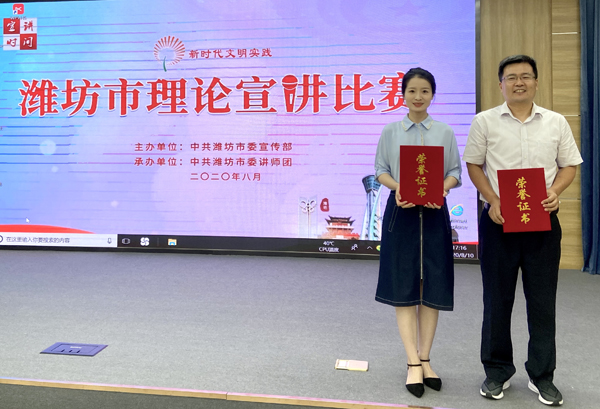 本网讯 8月10日,由潍坊市委宣传部主办、市委讲师团承办的潍坊市理论宣讲比赛决赛举行。我校经济管理学院张亚萍老师、马克思主义学院孙安忠老师进入决赛并分别荣获二等奖和三等奖。