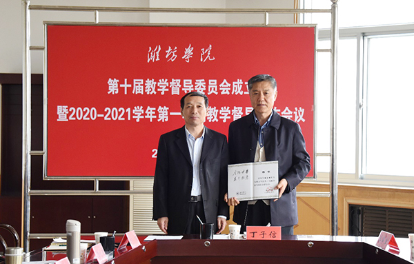 会上,第九届教学督导委员会副主任周玉衡对第九届教学督导工作进行了总结。教务处负责人宣读了《潍坊学院关于成立第十届教学督导委员会的通知》,丁子信为第十届教学督导委员会委员颁发聘书,第十届教学督导委员李长明教授代表第十届教学督导委员会委员发言。