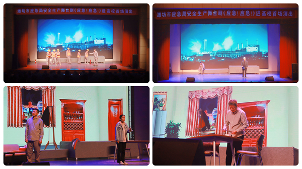 本网讯 4月8日,安全生产舞台剧《应急!应急!》进高校首场演出在学校图书馆报告厅拉开序幕。学校党委副书记王清明、潍坊团市委书记赵中国、潍坊市应急管理局局长李永光、潍坊市消防救援支队支队长张少见等领导,团市委、市区应急局、市安委会和驻潍高校团委等有关人员,学校学生工作处、实验室与设备管理处、总务处、保卫处、团委和各学院实验实训中心、团总支师生代表,近300人现场观看了演出。
