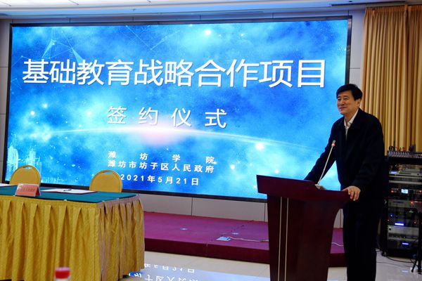 本网讯 5月21日上午,潍坊学院与坊子区基础教育战略合作签约仪式举行,双方就构建“U-G-S”(大学-政府-中小学校)合作模式,促进高等教育与基础教育“教、学、研、训”一体化和坊子区现代化教育强区建设,助力现代化高品质城市建设达成一致意见。协议中包括依托新建的坊子区博文现代学校建设潍坊学院附属实验学校,校地共同建设区域教师发展研究基地,共建区域基础教育研究与评价协同创新中心,共同引进高层次人才,携手开展乡村教育振兴行动等。