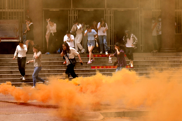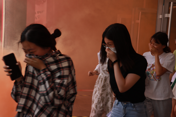 中午十二时四十分,警报声响起,逃生疏散演练正式开始。同学们纷纷用湿毛巾捂住口鼻,弯腰疾行,沿着逃生路线有序撤离到公寓前的空地。在活动的同时,学校印发了逃生自救小常识彩色传单,悬挂了宣传横幅,大学生自律委员会成员积极向同学们讲解火灾和地震疏散及逃生自救注意事项。