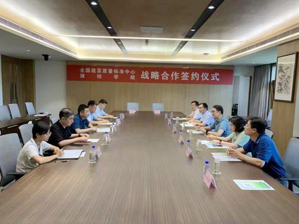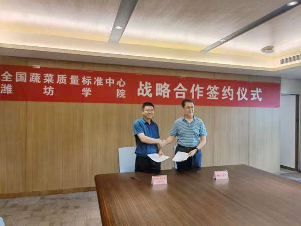 本网讯 为深入落实山东省百校教研产“三个一”融合工程实施方案,6月22日,潍坊学院、全国蔬菜质量标准中心战略合作协议签约仪式在寿光全国蔬菜质量标准中心举行。副校长赵光强,全国蔬菜质量标准中心党组书记、主任付乐启出席签约仪式。科研处、教务处、生物与农业工程学院相关负责同志参加了活动。
