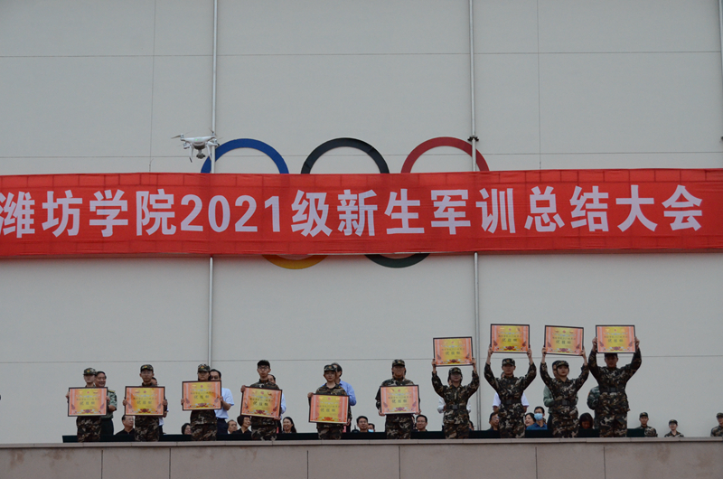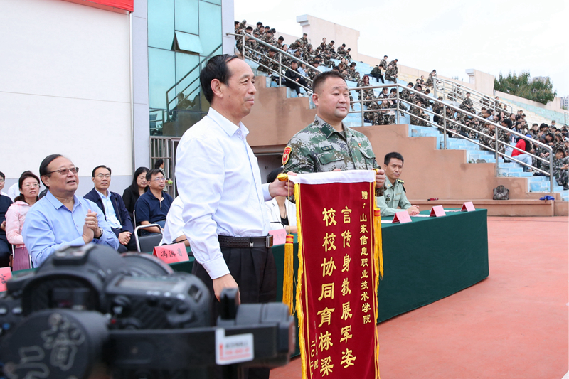会上,副校长丁子信向承训的山东信息职业技术学院赠送锦旗。军训团政委李学军宣读新生军训团表彰决定,与会领导为获奖集体和个人颁奖。2021级新生李雯颖代表参训学生发言。