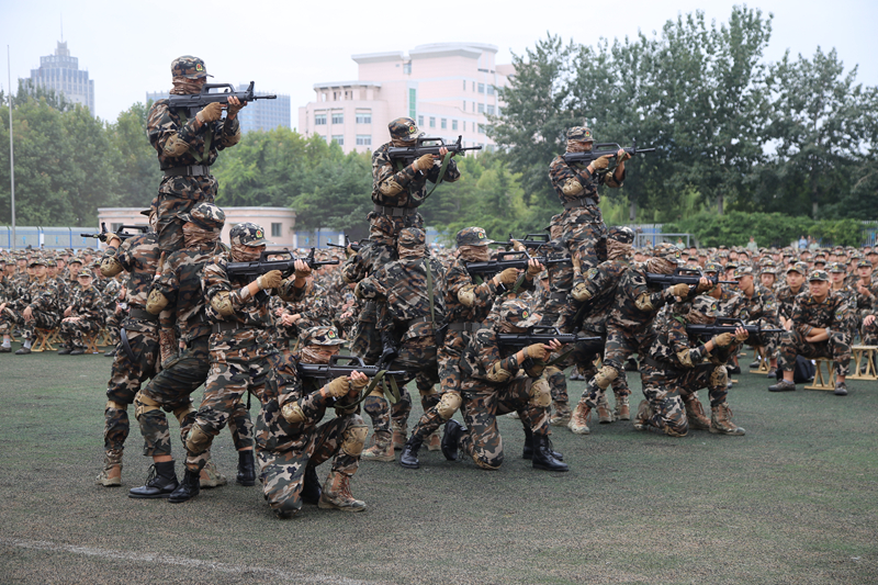庄严的升国旗仪式后,2021级新生军训方队迈着整齐的步伐,喊着嘹亮的口号,斗志昂扬的从主席台走过,接受与会领导的检阅。之后,他们进行了正规化养成、军体拳、格斗基本功、战术基础、献礼建党百年、校庆70周年等方队表演。