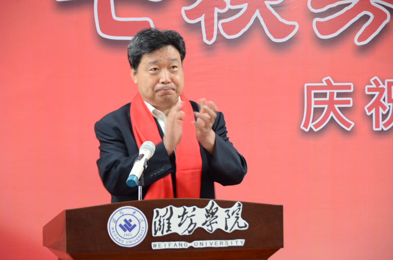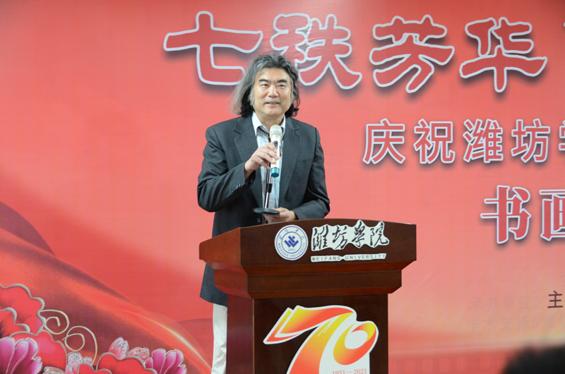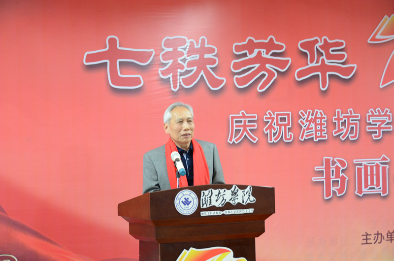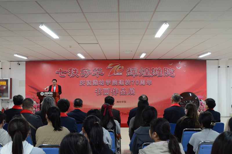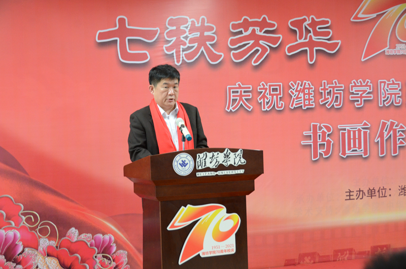 王清明代表学校向前来参加开展仪式的领导、艺术家、校友、师生致以热烈欢迎,向积极参与创作的老师们表示衷心的感谢,对此次书画摄影展顺利开幕表示热烈的祝贺。王清明表示,“七秩芳华、辉煌潍院”主题书画作品展得到了广大校友、在校师生和社会各界的大力支持。这既是一次难得的学术交流,也是联络感情、切磋技艺、增进友谊的良好契机。希望全校师生以校庆70周年为契机,全面推动学校各项事业不断迈上新水平,希望社会各界和广大校友一如既往地关心、关注与支持潍坊学院,共著潍院发展的锦绣华章。