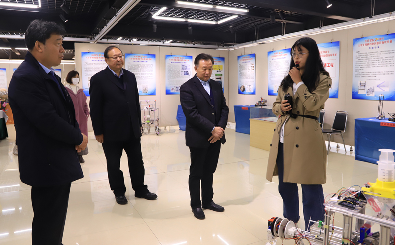 在成果展现场,学校领导在解说人员的引导下,饶有兴致地参观了成果展各展区。参观结束后,李东讲话,肯定了我校近几年在大学生创新创业教育工作方面取得的成绩。他指出,高校的创新创业教育,主要以国务院办公厅2015年印发的《关于深化高等学校创新创业教育改革的实施意见》和近期印发的《关于进一步支持大学生创新创业的指导意见》为指导,在三个方面下功夫,一是将创新创业教育贯穿人才培养全过程,不断提升学生的创新精神、创业意识和创新创意能力;二是进一步提升教师的创新创业教育能力,更好地引领学生创新创业;三是搭建更多更好的创新创业实践平台,为学生提供尽可能多的实践机会。他强调,要进一步整合、优化校内资源,在人力、财力等政策方面给予倾斜,推动我校创新创业教育高质量发展。