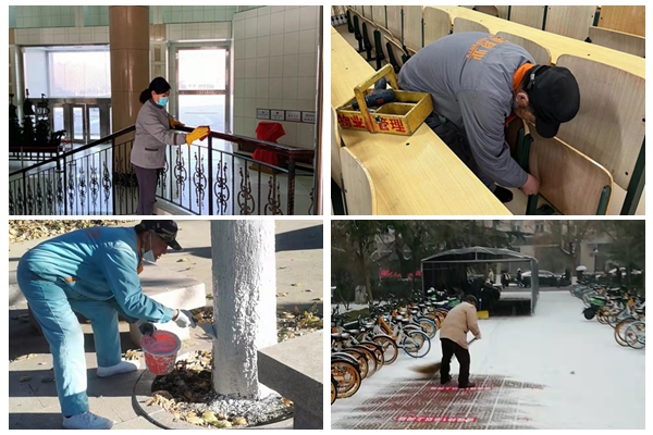 积雪洁白,落叶枯黄,两者交融一体,黄白相间,别有一番风味。但宜人的景致也会带来安全隐患,天暖化水,夜冻成冰的时候,更为危险,必须及时扫除。这样一来,冬雪和枯叶便给校园建设与管理处的工作人员带来了巨大的工作量。一位工作人员说:“冬季落叶较多,下雪也多,我们得一遍遍地来回清扫,才能使校园道路保持干净整洁。”为尽快清理路面积雪落叶清理,工作人员使出了浑身解数,各种工具加持,促使劳动效率提高。