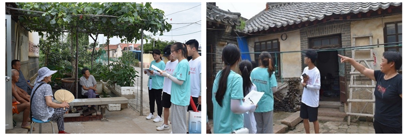 7月6日至7日,实践团队成员兵分两路,分别前往威海市乳山市崖子镇田家村和大崮头村,与相关部门取得联系,咨询崖子镇田家村红色特色村培育成果,参观了村中现存的红色建筑,了解到许多民居背后的革命历史典故,在指导教师的带领下,结合实践成员自身的理论知识与当地实践过程中出现的问题进行讨论,并了解目前乡村改造在该地区的情况;深入了解当地居民的生活情况与村庄的建筑环境,询问当地村民对于乡村改造的建议,实践团队的成员们认真观察记录好信息。