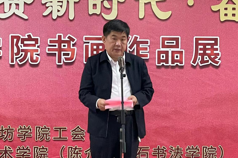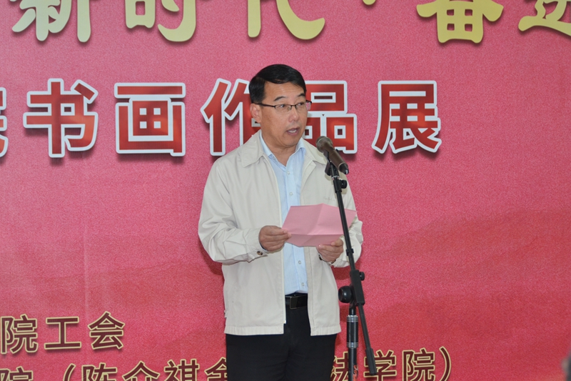 单振涛代表学校致辞,向参加开幕式的各位领导、艺术家表示热烈欢迎,向积极参与创作的广大师生和校友表示衷心感谢。他表示,本次书画展的成功举办,是学校贯彻落实“五育并举”任务,弘扬“奋进新征程,建功新时代”主旋律的重要举措,必将进一步提高师生审美和人文素养,更好彰显美育培根铸魂的重要作用。