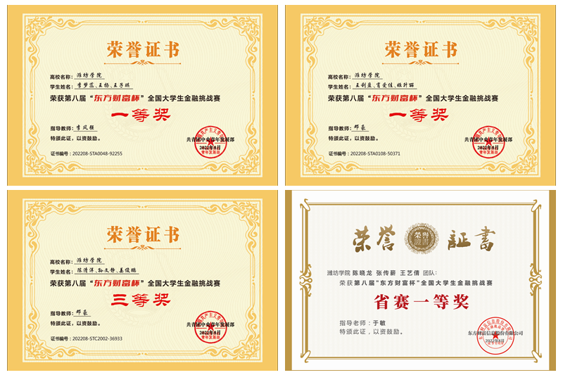 本网讯 近日,由共青团中央青年发展部主办,全国学校共青团研究中心和东方财富信息股份有限公司共同承办的第八届“东方财富杯”全国大学生金融挑战赛圆满落幕。我校团队获得全国一等奖2项、三等奖1项,获得山东省一等奖6项、二等奖4项、三等奖14项。