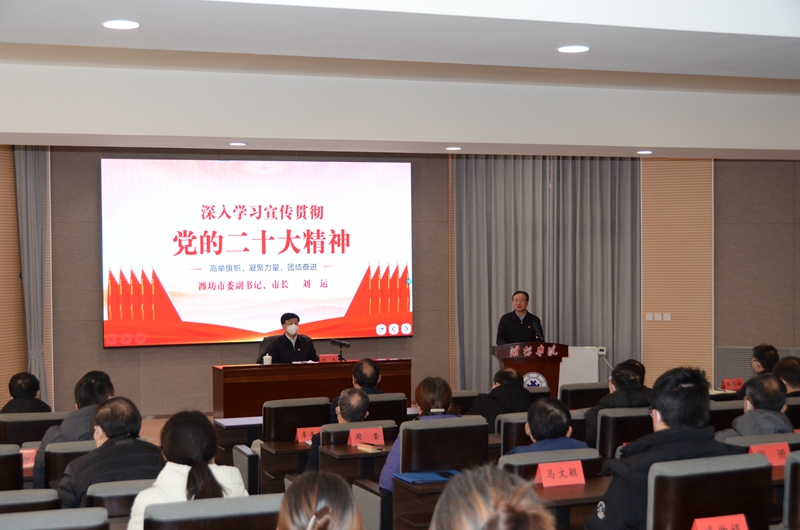 刘运向学校师生介绍了全市经济社会发展情况。他说,潍坊文化底蕴深厚、交通区位优越、先进制造业基础雄厚、农业领先全国、教育全国有名。当前,全市上下正在以党的二十大精神为指引,对标对表党的二十大新思想新论断、新部署新要求,对标对表习近平总书记对山东工作的重要指示要求,对标对表省委十二届二次全体会议精神,深入落实市委“一四四一”工作思路和部署要求,奋力把潍坊发展推向新高度,加快建设新时代社会主义现代化强市。