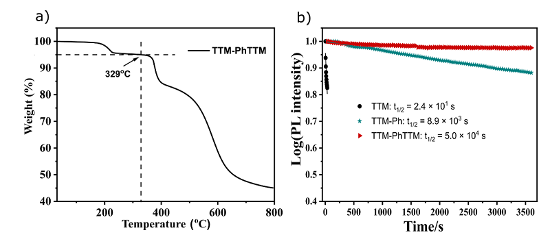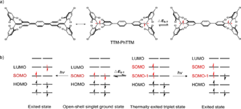 该论文首次报道了具有发光性质的凯库勒(Kekulé)双自由基TTM-PhTTM。实验和理论计算结果表明,TTM-PhTTM具有开壳单线态基态,双自由基特征为90%。由于其单线态-三线态能隙较小,开壳单线态基态可以被热激发为三线态(图1)。在室温条件下,TTM-PhTTM在各种溶剂中具有深红光发射。TTM-PhTTM还具有较高的热稳定性和光稳定性,在光电子和磁学方面显示出巨大应用潜力。
