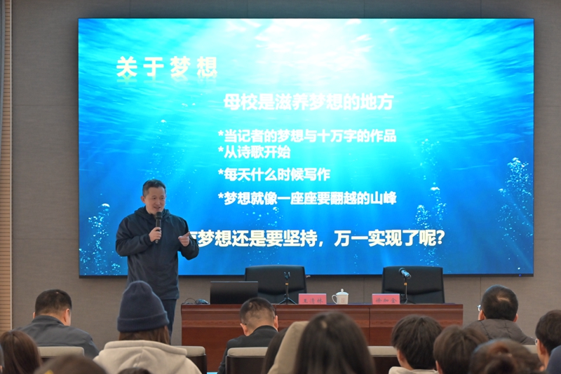 王清林以《让梦想驱动成长——与即将毕业的大学生朋友谈创业与成长》为题,从“关于梦想、关于创业、关于成长”三个维度,分享了自己在母校求学时的多方面锻炼、在记者岗位上10年的成长积累、在激情创业历程的拼搏奋斗。王清林鼓励同学们要坚持梦想、努力奋斗,保持持续学习的态度和勇于担当的品格,既憧憬未来,也要活在当下,让梦想驱动自己不断成长。