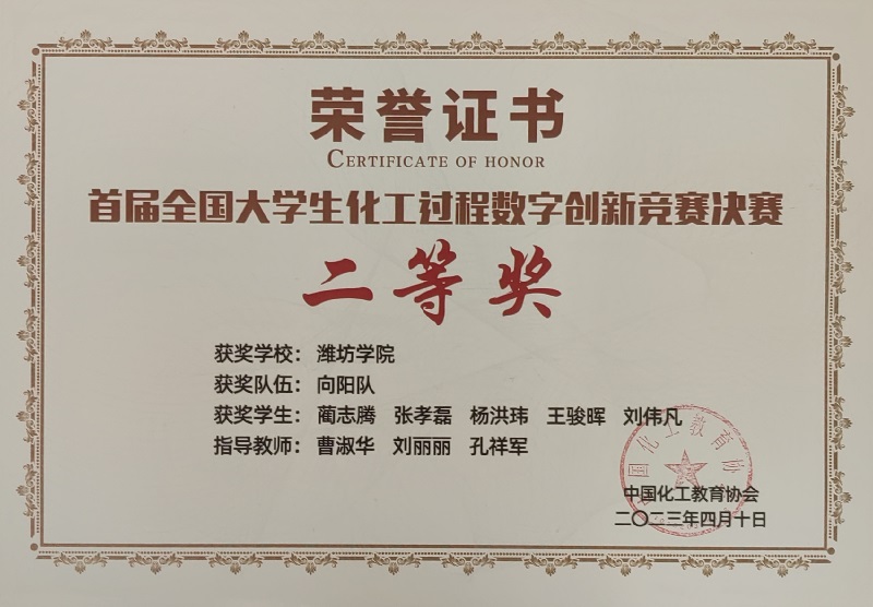 本网讯 日前,由中国化工教育协会主办的首届全国大学生化工过程数字创新竞赛决赛在南京工业大学举行,我校化学化工与环境工程学院化学工程与工艺专业本科生蔺志腾、张孝磊、杨洪玮、王骏晖、刘伟凡组成的代表队获二等奖。