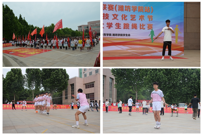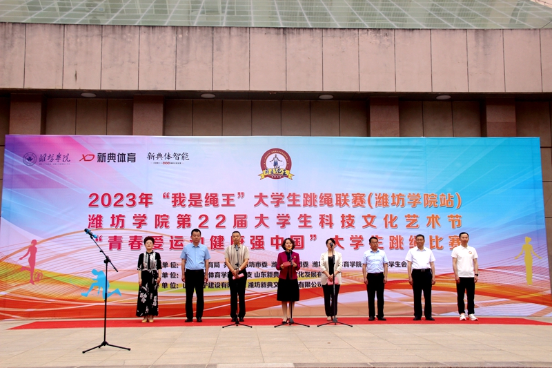 本网讯 为深入学习宣传贯彻党的二十大精神,进一步丰富大学校园文化生活,教育引导青年学生磨炼坚强意志,锻炼强健体魄,彰显青年学生昂扬向上的精神风貌,5月25日,我校体育学院举办了2023年“我是绳王”大学生跳绳联赛(潍坊学院站)暨潍坊学院第22届大学生科技文化艺术节“青春爱运动 健康强中国”大学生跳绳比赛。学校党委副书记徐梅、潍坊市青少年发展服务中心主任王海燕、潍坊市体育局四级调研员燕景伦、学校党委委员、宣传部部长单振涛出席开幕式。