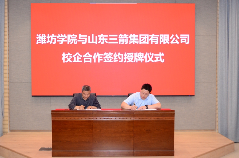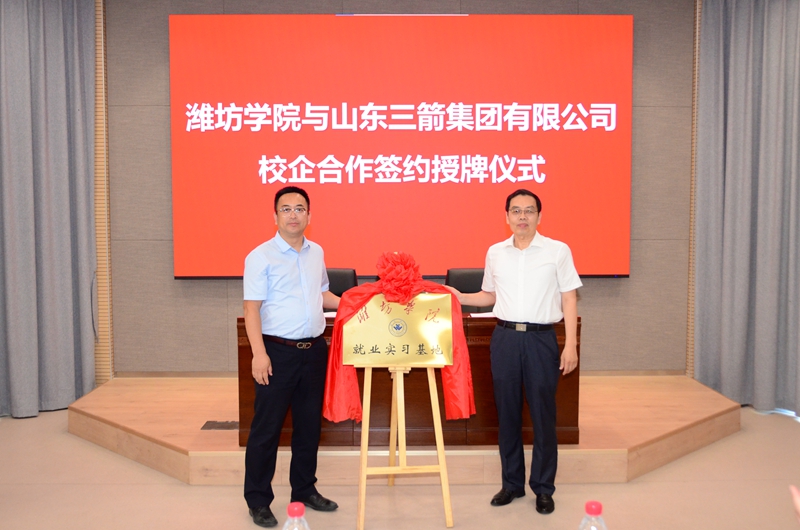 本网讯 6月9日上午,学校与山东三箭集团有限公司校企合作签约授牌仪式在知新楼210会议室举行。学校党委委员、副校长王旭升,山东三箭集团有限公司党委委员、总工程师徐新刚出席仪式。