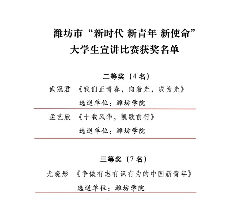 本网讯 近日,潍坊市委宣传部办公室发布关于潍坊市“新时代 新青年 新使命”大学生宣讲比赛获奖情况的通报。我校学子荣获二等奖2项,三等奖1项。