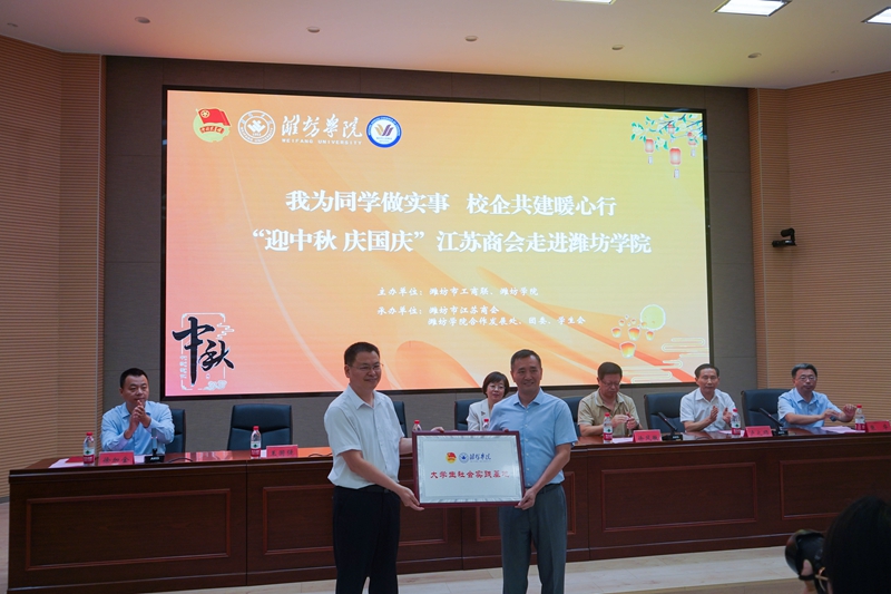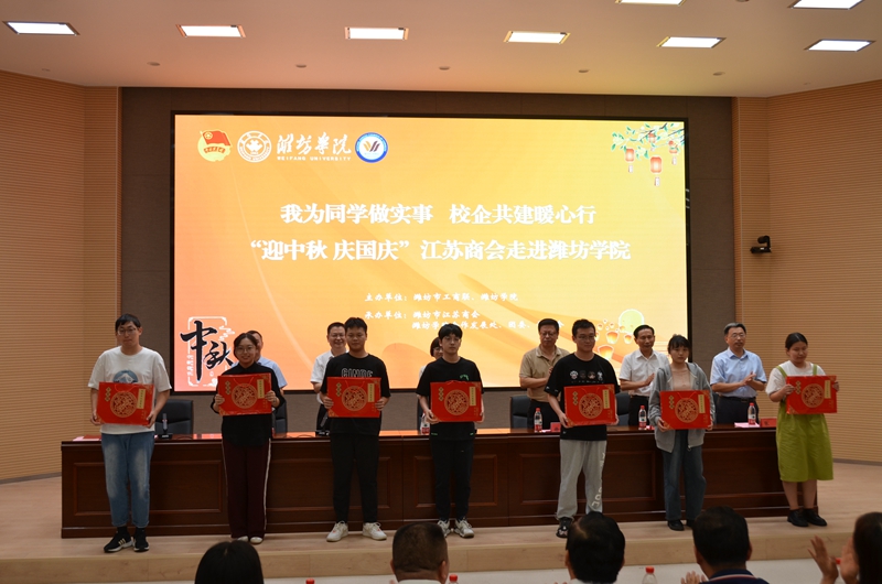 活动现场,主席台领导向青年学生代表赠送了中秋月饼,并向大家致以节日的祝福。任立春代表学校向潍坊市江苏商会授予“大学生社会实践基地”牌匾。潍坊市江苏商会副会长、山东通匠建设工程有限公司总经理李均,山东成恒经贸有限公司总经理、我校2008级校友朱强智,我校青年学生代表徐梓皓同学,分别作了交流发言。