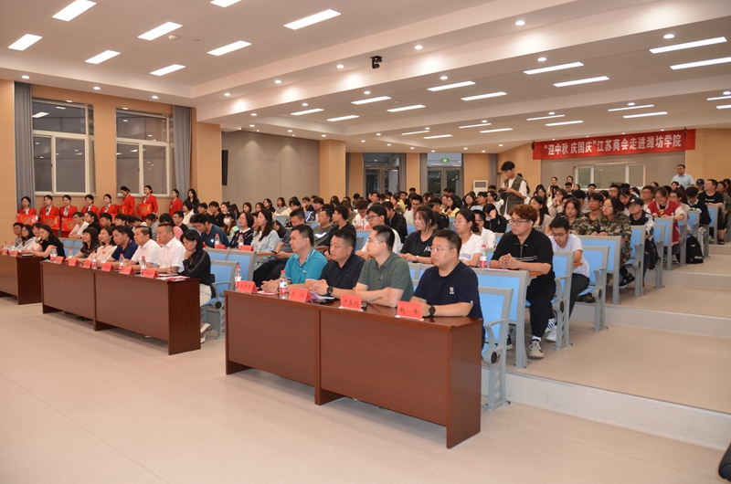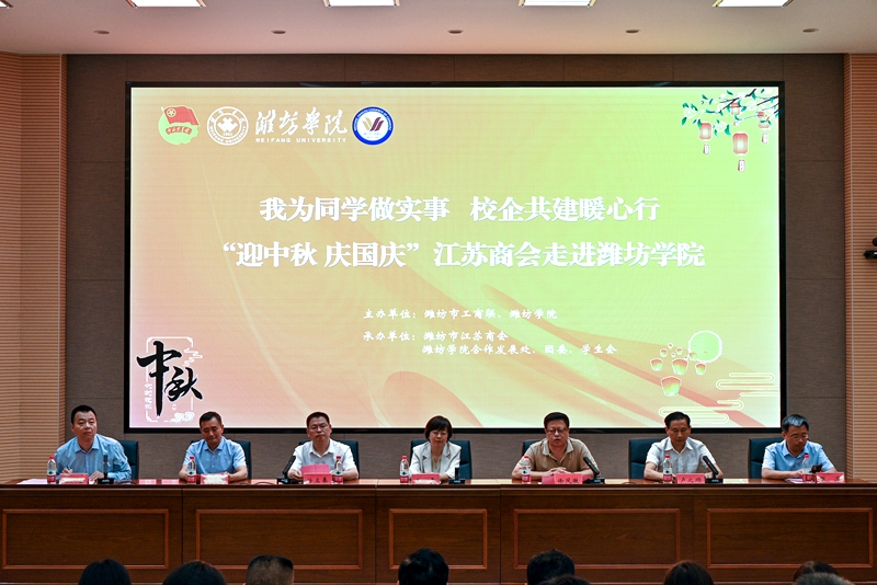 本网讯 9月25日,我为同学做实事 校企共建暖心行——“迎中秋 庆国庆”潍坊市江苏商会走进潍坊学院活动在知新楼一楼报告厅举行。潍坊市政府副秘书长王霞,潍坊市委统战部副部长、市工商联党组书记、常务副主席徐凤徽,潍坊市江苏商会会长卢之顺、秘书长王国强出席,校党委书记徐梅会见王霞一行,党委委员、副校长任立春出席活动并致辞。商会企业家代表,合作发展处、团委负责同志,各学院团总支负责同志、青年学生代表约160人参加活动。