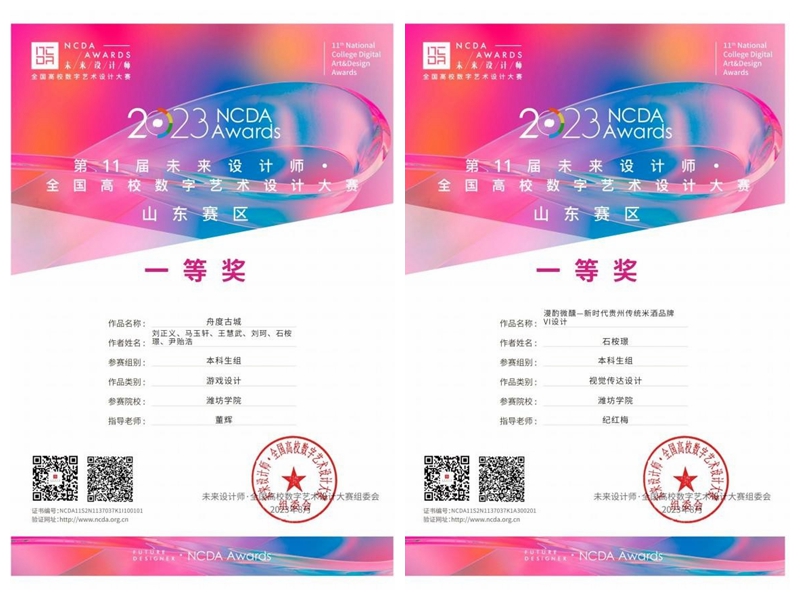 在未来设计师·全国高校数字艺术设计大赛中,我校传媒学院数字媒体技术专业学生刘正义、马玉轩、王慧武、刘珂、石桉璟、尹贻浩组队制作的《舟度古城》获山东省赛区游戏设计组一等奖,全国游戏设计组三等奖。石桉璟设计的《漫的微醺--新时代贵州传统米酒品牌VI设计》荣获山东省赛区视觉传达赛道一等奖,国赛三等奖。此外,李子怡同学的作品《唐朝吉祥插画制作》荣获山东省赛区数字绘画组二等奖、宋鑫的作品《邮出新面貌》荣获山东省赛区动画与视频设计组三等奖。