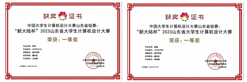 在第16届中国大学生计算机设计大赛中,传媒学院数字媒体技术专业学生杨文俊、杨玉明、宿文飘、邓玥、王慧武制作的游戏设计作品《药灵》取得山东省赛区一等奖、国赛二等奖的优异成绩。2021级动画专业王茹雪同学设计的《药食》、薛晓雪同学设计的作品《医瘟》在数媒静态设计赛道取得山东省一等奖、国赛三等奖的好成绩;张茗涵设计的作品《理疗》荣获山东省三等奖。