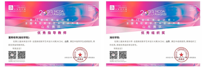 每个学生成功的背后,离不开学院优秀教师的指导。在未来设计师·全国高校数字艺术设计大赛中,传媒学院数字媒体技术教研室主任董辉、数字媒体技术教研室老师纪红梅荣获优秀教师称号。同时,潍坊学院荣获优秀组织奖。